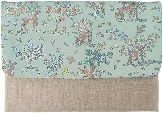 ●スモーキーなアイスグリーンの地色に、植物やベリーが生い茂る森で遊ぶダマジカをチャーミングに描いたEttaの電磁波防護ポーチです